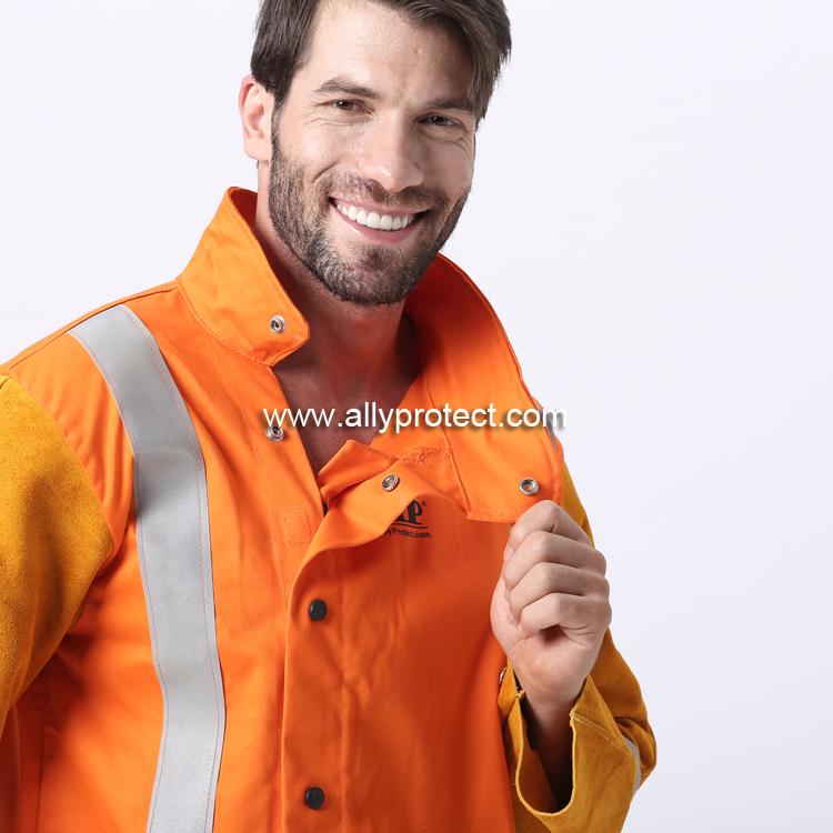 袖由抗火隔熱的牛二層皮制成,衣身由水洗防火阻燃布制成,安全舒涼;
